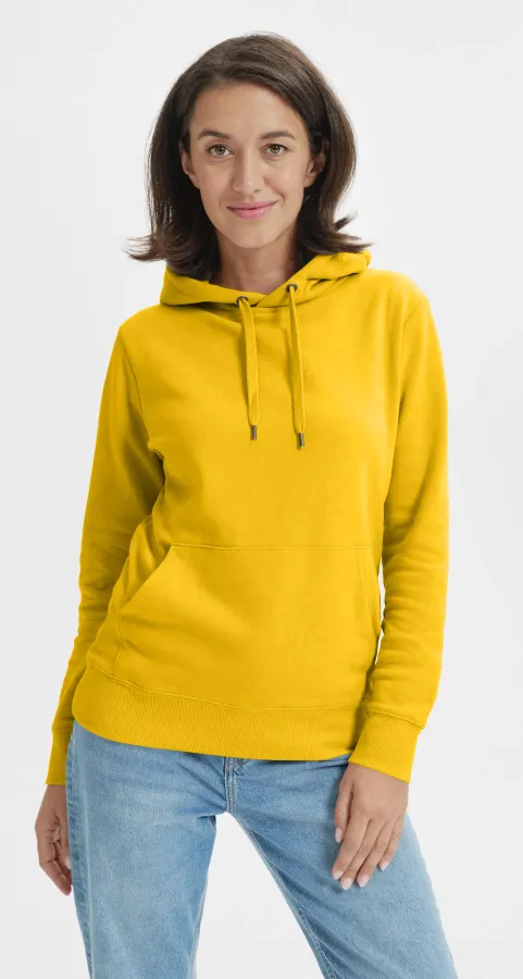 Žlutá levná dámská mikina bez zipu s kapucí, L